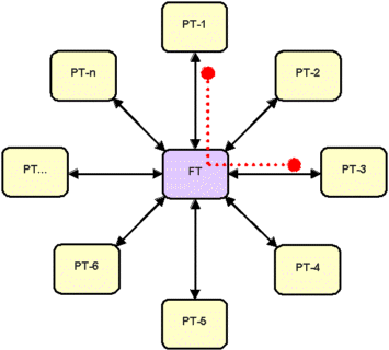 Initially DECT has been design with the idea of a star topology system architecture which is to be understood as a DECT Base station (FT) being in the centre of the star with the Portable terminations (PT) at the outer nodes connected to the Base. The consequence of this has been that if two Portable terminals are to communicate one with each other they had to be connected through the Base station. As far as the capacity of such DECT system is concerned, due to the fact that all connections have to be routed via the FT, the traffic capacity that the FT itself could offer becomes the traffic determinator of the entire DECT system - which, if only one Radio is used at the FT in the best case will be up to 24 channels available for all participants in the system (e.g. if all those are used for data traffic an up to 2 Mbps system data rate).
