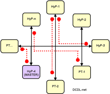 A HyP terminal is a DECT terminal that can receive calls as normal PPs do, and, can initiate calls as normal FPs do. A DCDL-net still has a Base station (FP) which though still capable of routing calls is mainly use as a synchronisation terminal with additional information and control functions. A terminal playing the role of the Base station in a DLDC-net is called not surprisingly a MASTER and is used to control the membership in a DCDL-net, distribute DCDL-net specific membership information to all members, and assist communication between any two members. All members are synchronised to the Master and posses all the necessary information (identities and keys) allowing them at any time to set up a call to a particular terminal (another DCDL-net member) just by placing a call request as a normal Base station would do. As every call is served by two independent radio parts (opposite to the star topology case where in every call one and the same radio part was participating - the one of the FP), every pair of two terminals could use up to 24 channels (out of 240 channels available per DCDL-net), or up to 2 Mbps data rate with 8th level modulation scheme.
