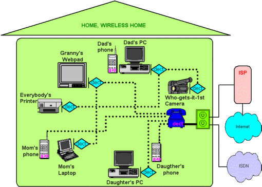 Let us imagine a typical today's home scenario. A House. A house with 2 PCs - the Dad's PC and the Daughter's PC; one printer - Everybody's Printer; a camera - Who-gets-it-first's camera; 3 handsets - Dad's Handset, Mom's handset and the Daughter's handset. And few extra (advanced) events - Dad's got recently a Palm but usually forgets it in the office; Mom's bringing from time to time at home her Laptop; Granny hates computers but knows what WWW is - hence she's got a Webpad - as simple as that. Not to forget, the simplest with acceptable for the moment data rate ISDN network connection - two 64 kbps parallel ISDN channels to the fixed network.